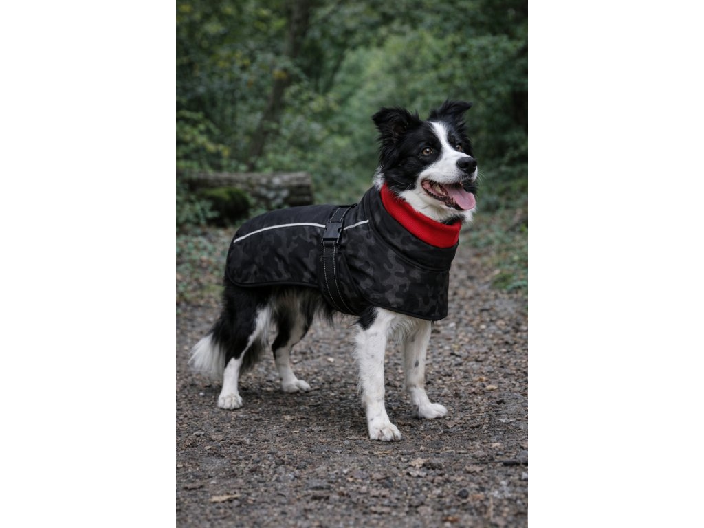Voděodolný zimní softshell a teplá podšívka udržují psa v suchu a teple.