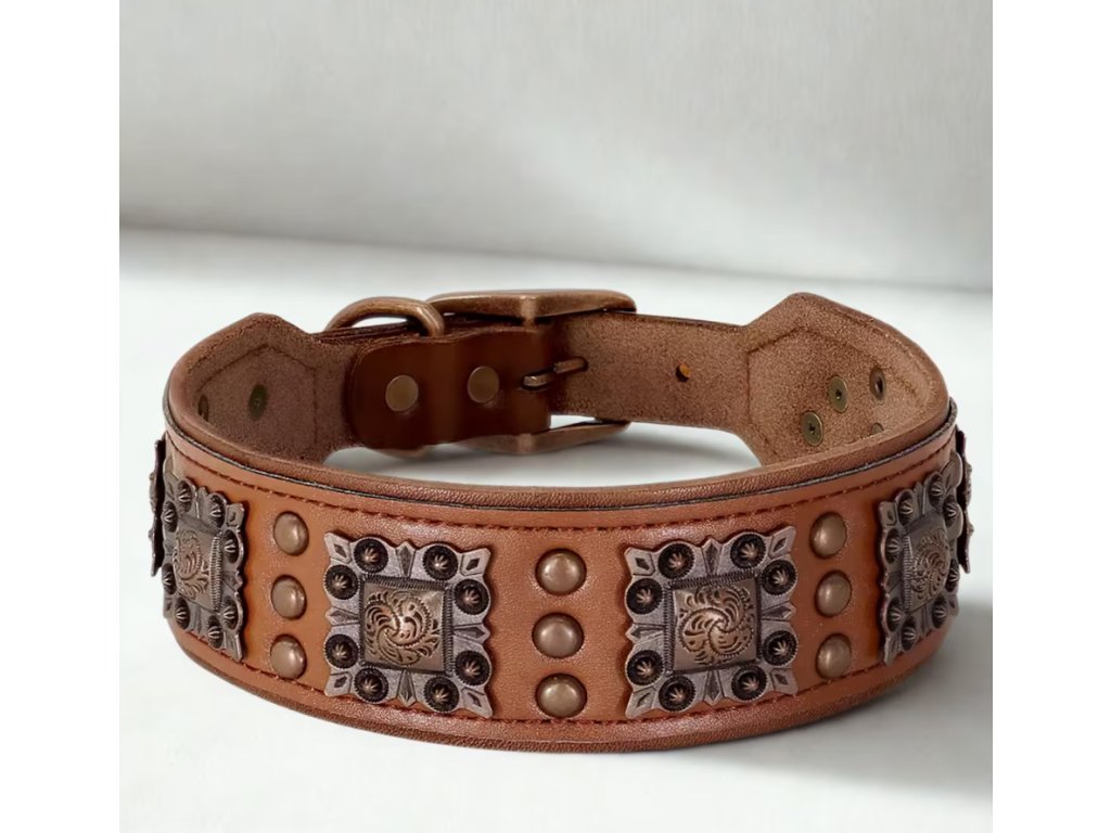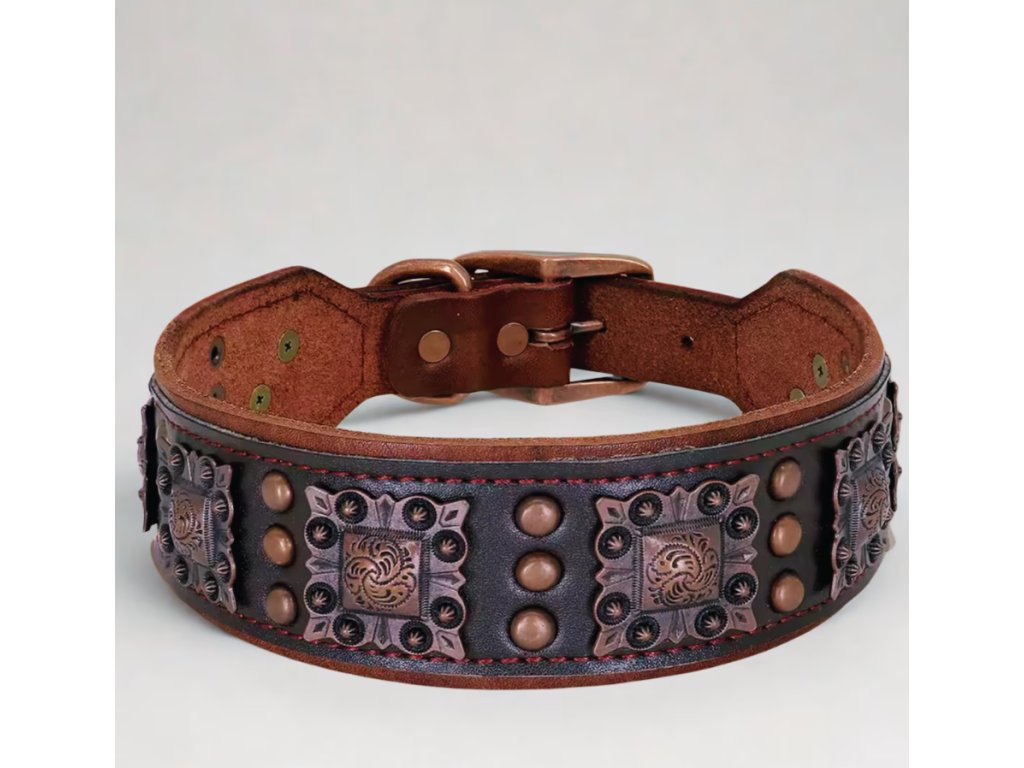 Stylový drsňácký obojek pro větší psy, s aplikacemi v podobě indiánských motivů je ušit z odolné a příjemné přírodní usně, která obstojí i v zátěži. Samozřejmě je opatřen měkkou koženou podšívkou, šitou do kulatých hran, která zvyšují bezpečí i komfort pejska.