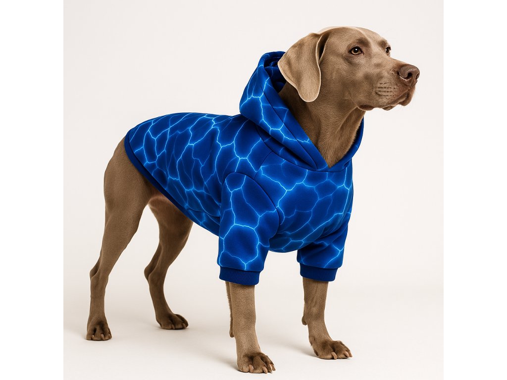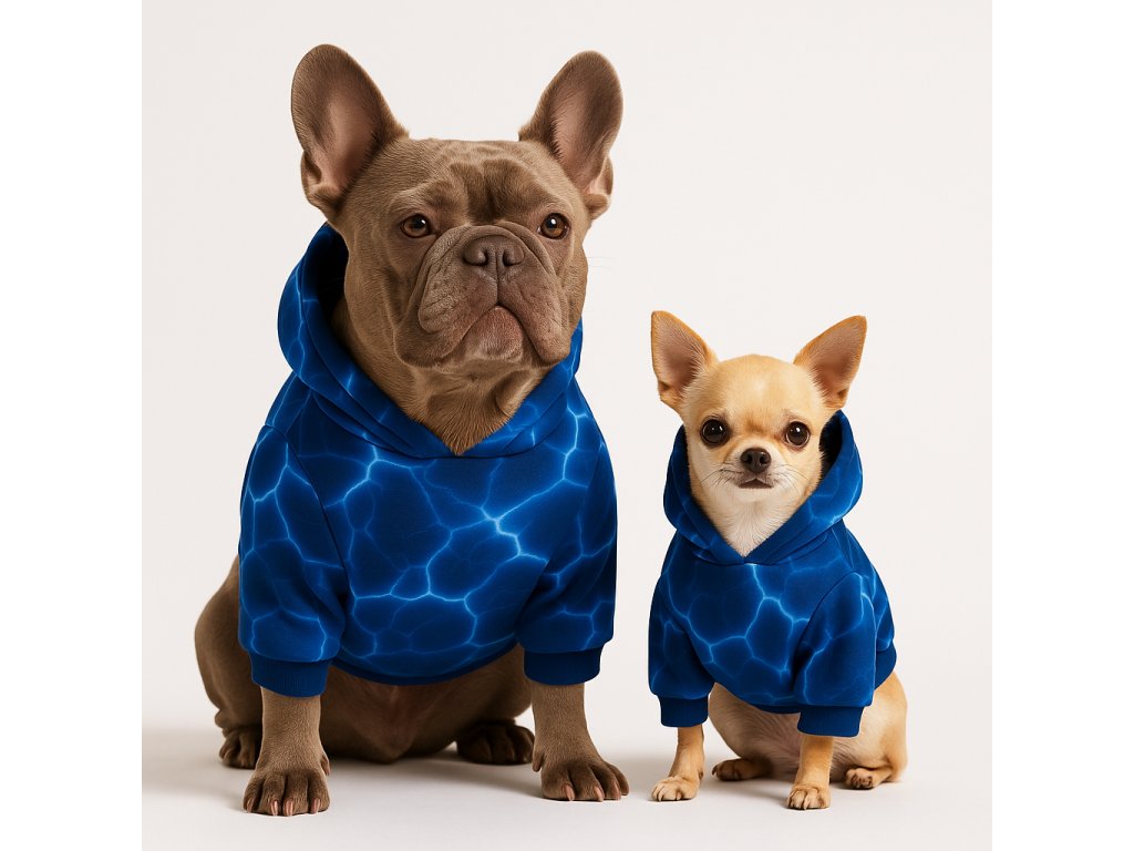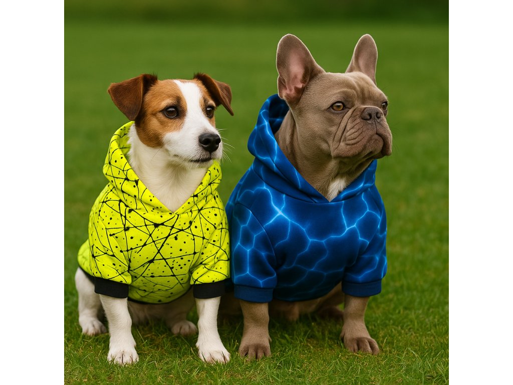 Moderní vzhled – střih s kapucí a elegantní vzory zařazují mikinu mezi originální oblečky pro psy a díky prémiovému zpracování může být vnímána i jako luxusní obleček pro psy.