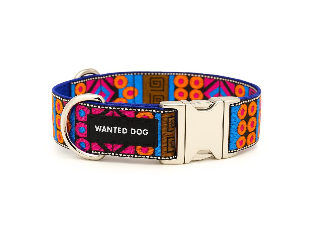 Barevný nylonový obojek pro psa značky Wanted Dog představuje perfektní kombinaci odolnosti, praktičnosti a originálního vzhledu. Díky ručnímu šití, pevnému nylonu a jedinečné designové stuze získáte kvalitní obojek pro psy, který je vhodný pro každodenní použití, vydrží dlouhá léta a vašemu pejskovi dodá styl.