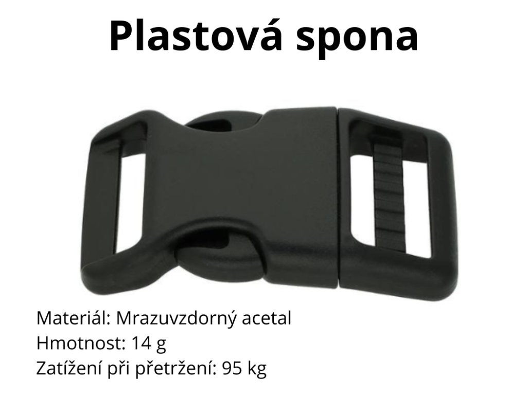 Plastová spona – mrazuvzdorný acetal, zatížení až 95 kg, hmotnost 14 g.