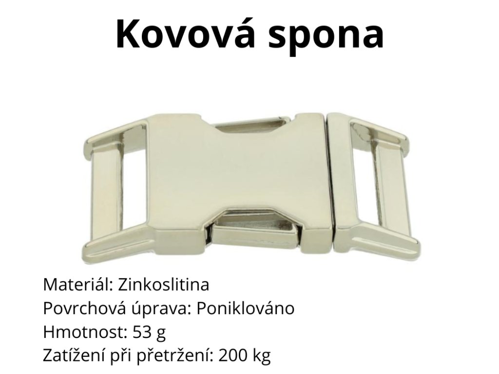 Kovová spona – zinkoslitina, poniklovaná, zatížení až 200 kg, hmotnost 53 g.
