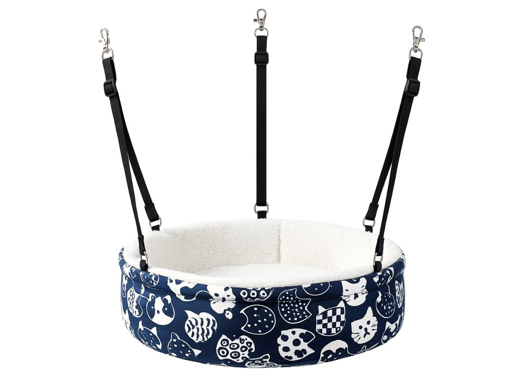 Díky závěsné konstrukci se pelíšek snadno připevní do klece, na skříň, pod židli nebo na jiné vhodné místo v domácnosti. Robustní popruhy s kovovými karabinami zajišťují stabilitu a bezpečné zavěšení. Integrovaný ocelový kruh v konstrukci pomáhá udržet tvar pelíšku i při dlouhodobém používání.