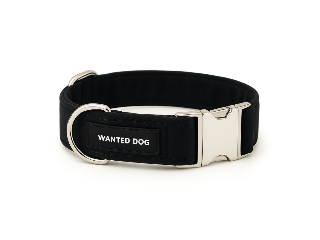 Černý obojek pro psa – nadčasový design, naše ruční výroba Wanted Dog
