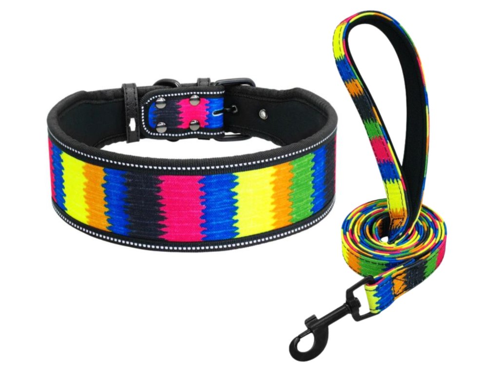 SET: Široký vzorovaný obojek pro psa s reflexními prvky a vodítko DÚHA- velikost L
