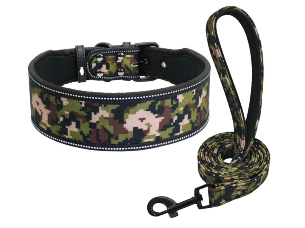 SET: Široký vzorovaný obojek pro psa s reflexními prvky a vodítko VOJENSKÝ - velikost L